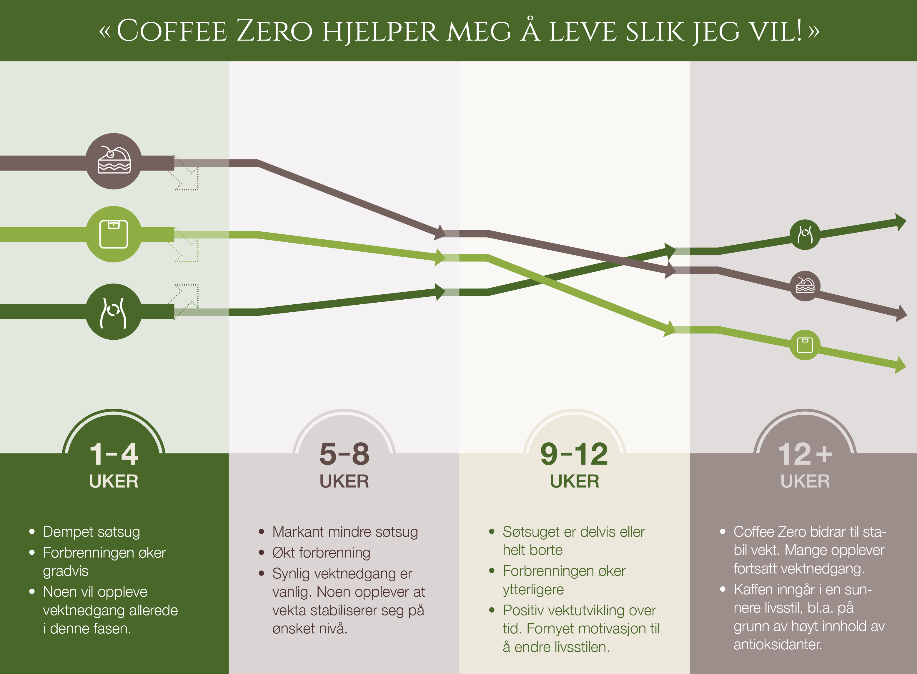 Enkelt sagt består Coffee Zero-effekten av fire faser. I hver fase vil du kunne oppleve fremskritt med hensyn til forbrenning, søtsug og vektkontroll. Under finner du en nærmere beskrivelse av hver fase, slik den kan arte seg for en typisk Coffee Zero-kunde.